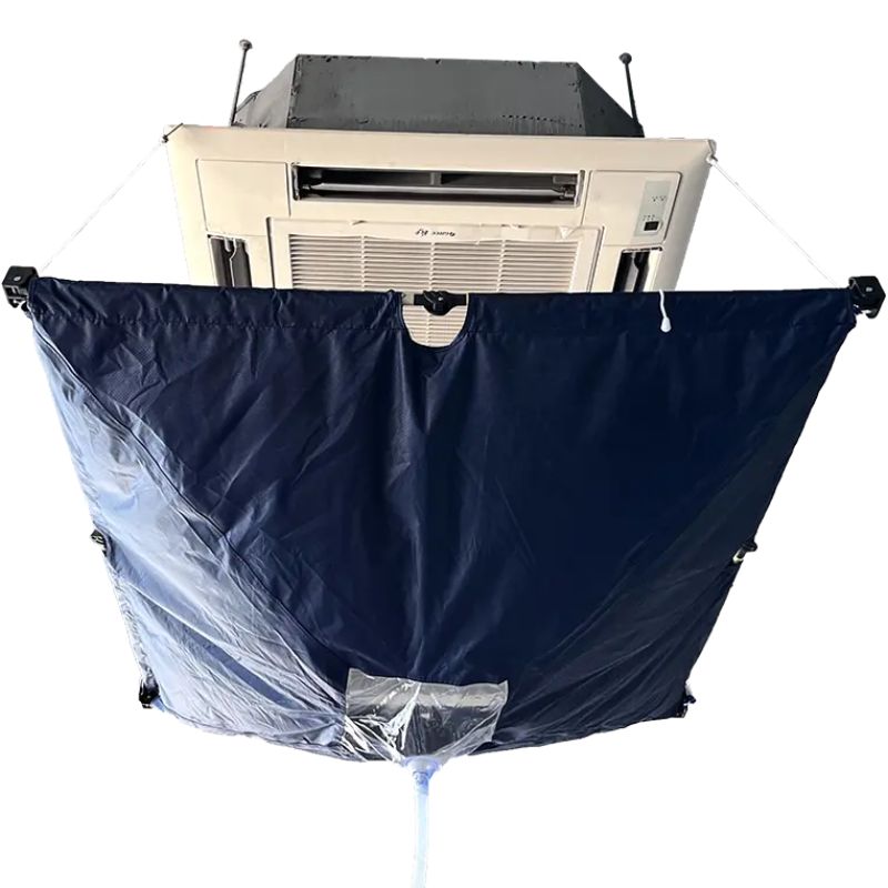 La bolsa de limpieza para aire acondicionado de techo tipo cassette CSC-2 está fabricada con tejido Oxford jacquard de alta calidad, un material impermeable, suave y duradero. Su diseño retráctil se adapta fácilmente a diversos tamaños y modelos de aires acondicionados de pared y está equipada con una cortina de agua transparente y un tapón de agua, lo que evita eficazmente las salpicaduras de líquido durante la limpieza. Gracias a su manguera de drenaje integrada en la parte inferior de la bolsa, el agua sucia se puede vaciar de forma segura directamente en el depósito.