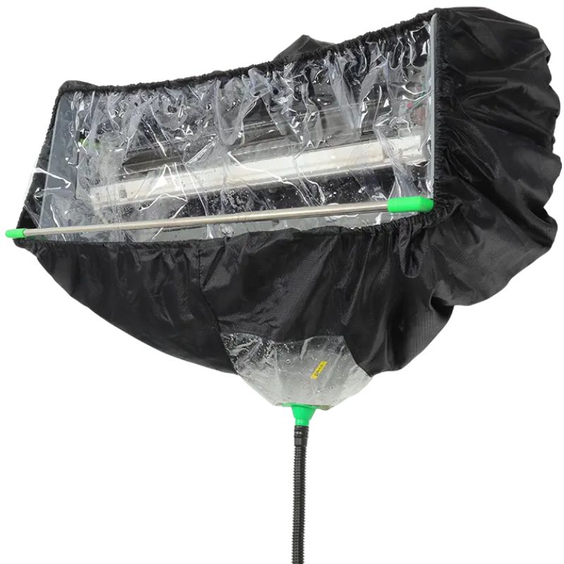 La bolsa de limpieza CSC-1 para aires acondicionados Split está fabricada con tejido Oxford jacquard de alta calidad, un material impermeable, suave y duradero. Su diseño retráctil se adapta fácilmente a diversos tamaños y modelos de aires acondicionados de pared y está equipada con una cortina de agua transparente y un tapón de agua, lo que evita eficazmente las salpicaduras de líquido durante la limpieza. Gracias a su manguera de drenaje integrada en la parte inferior de la bolsa, el agua sucia se puede vaciar de forma segura directamente en el depósito.