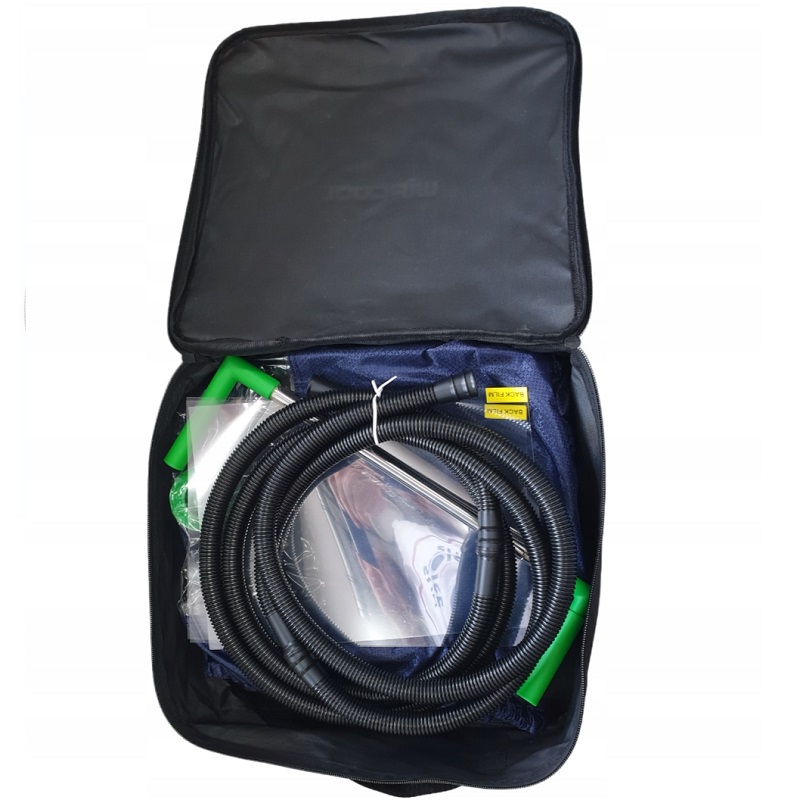 Esto facilita mantener un entorno de trabajo limpio y seguro. La bolsa se adapta perfectamente a la forma del aparato a limpiar, y la manguera frontal, junto con el panel frontal transparente, permite un fácil acceso a la boquilla de la pistola pulverizadora. Esto permite llegar a todos los rincones del aire acondicionado sin abrir la bolsa.