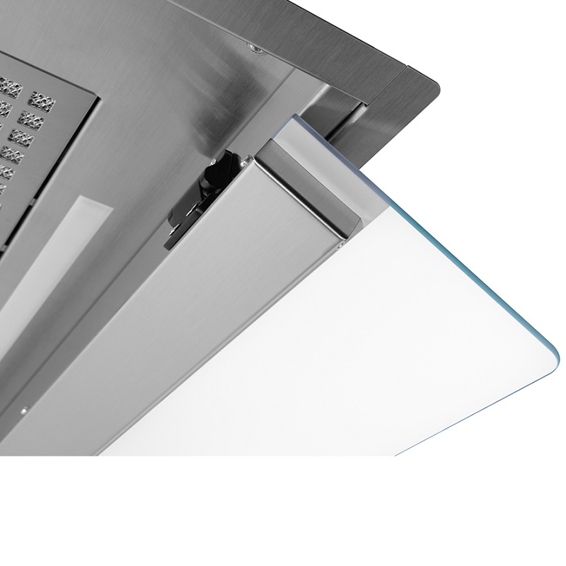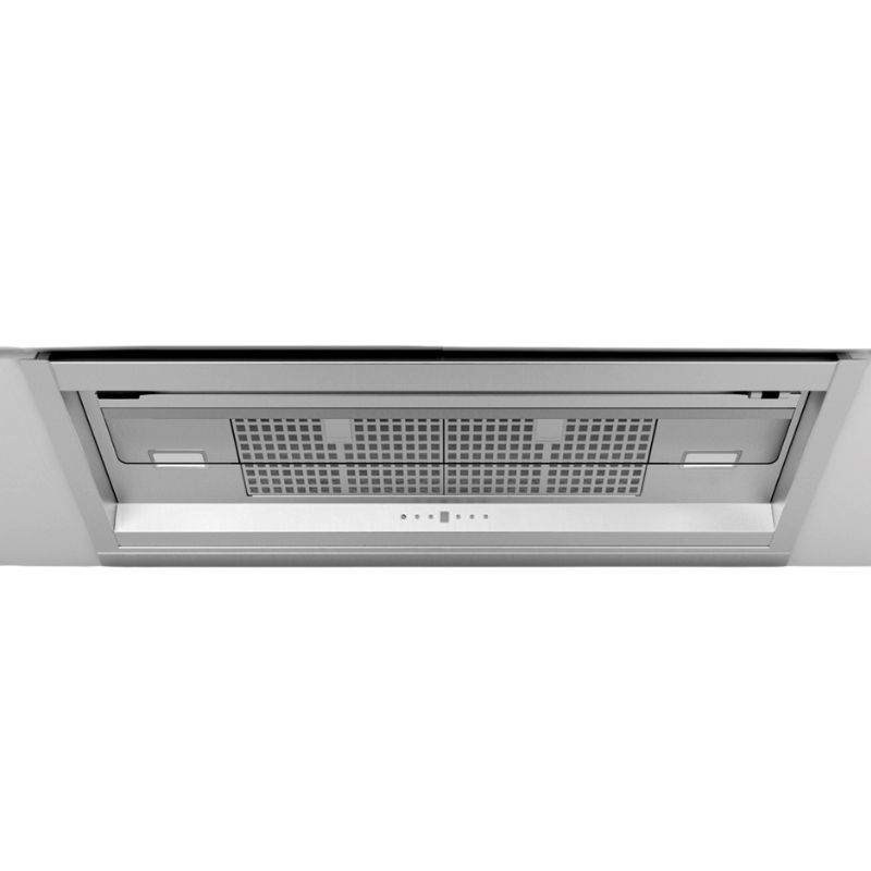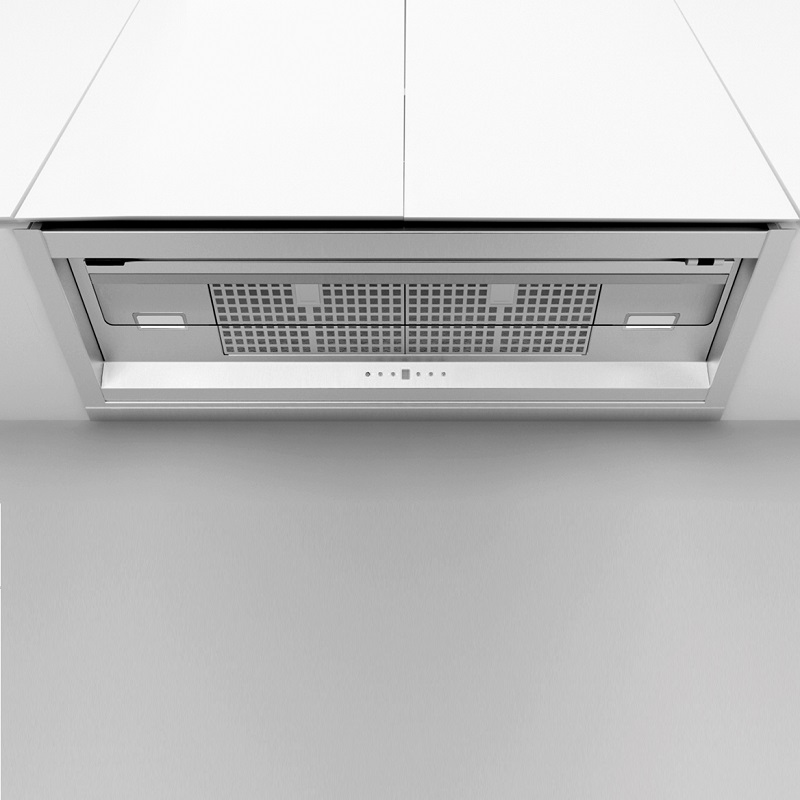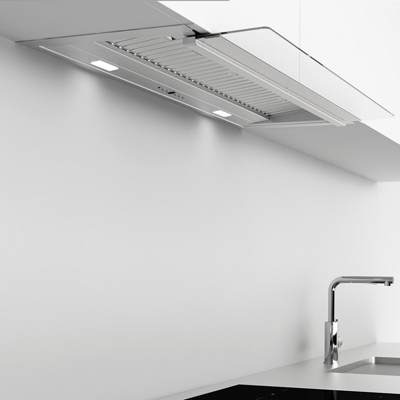 La campana extractora integrada Frecan Note, fabricada íntegramente en acero inoxidable, se integra completamente bajo los muebles, permaneciendo completamente invisible. Gracias a su visera abatible, este modelo permite la extracción perimetral (con la visera cerrada) o la extracción tradicional (con la visera abierta). Esta última proporciona una mejor extracción al usarla con los quemadores frontales de la zona de cocción.