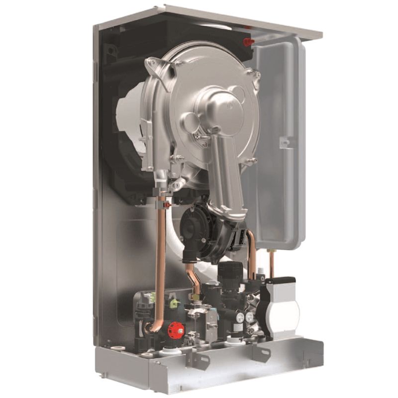 Está equipada con un intercambiador de calor de placas único para la producción instantánea de agua caliente sanitaria. Las entradas hidráulicas están cubiertas por la carcasa de la caldera.