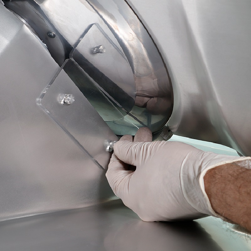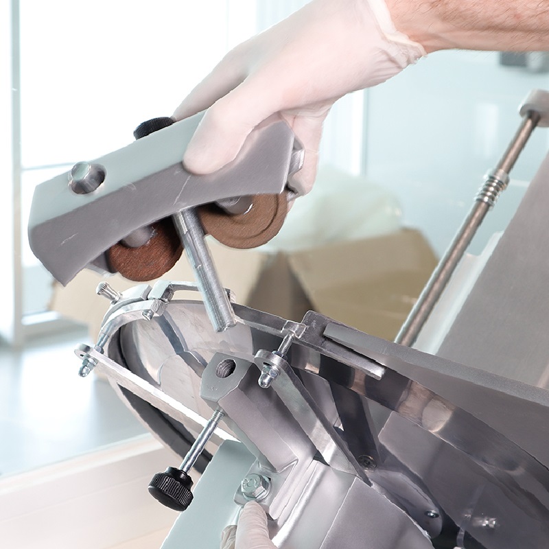Todas las cortadoras cuentan con un anillo protector fijo que resguarda el filo de la cuchilla, garantizando una seguridad óptima durante la limpieza y el mantenimiento. También se incluyen protectores de manos de plástico transparente. El carro está montado sobre cojinetes autolubricantes para un deslizamiento suave, lo que facilita el corte de embutidos, quesos, asados y más.