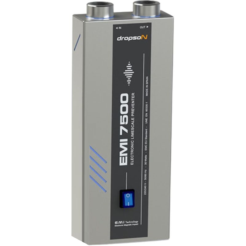 El descalcificador magnético Dropson EMI 7500, con una capacidad de 9 m³/h, cuenta con una carcasa y chasis de acero inoxidable con acabado satinado. Este descalcificador electrónico de última generación funciona sin sal, no requiere mantenimiento y elimina el desperdicio de agua. Está diseñado para su instalación en fábricas, empresas y hogares.