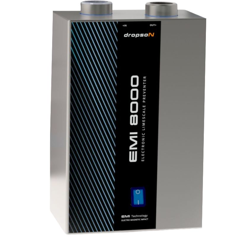 El descalcificador magnético Dropson EMI 8000, con una capacidad de 9 m³/h, cuenta con una carcasa y chasis de acero inoxidable con acabado satinado. Este descalcificador electrónico de última generación funciona sin sal, no requiere mantenimiento y elimina el desperdicio de agua. Está diseñado para su instalación en fábricas, empresas y hogares.
