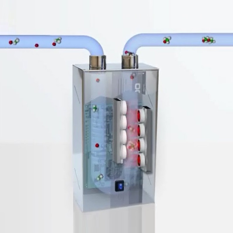 Entrada de agua: Los iones de calcio (Ca) y carbonato (CO₃), responsables de la acumulación de cal, se encuentran suspendidos en el agua. Cristalización: La combinación de impactos magnéticos y la energía cinética del vórtice induce la cristalización de los iones de calcio y carbonato suspendidos en el agua. Se instala en la entrada principal de agua fría e incluye un filtro y manguitos electrolíticos, según el material de la tubería.
