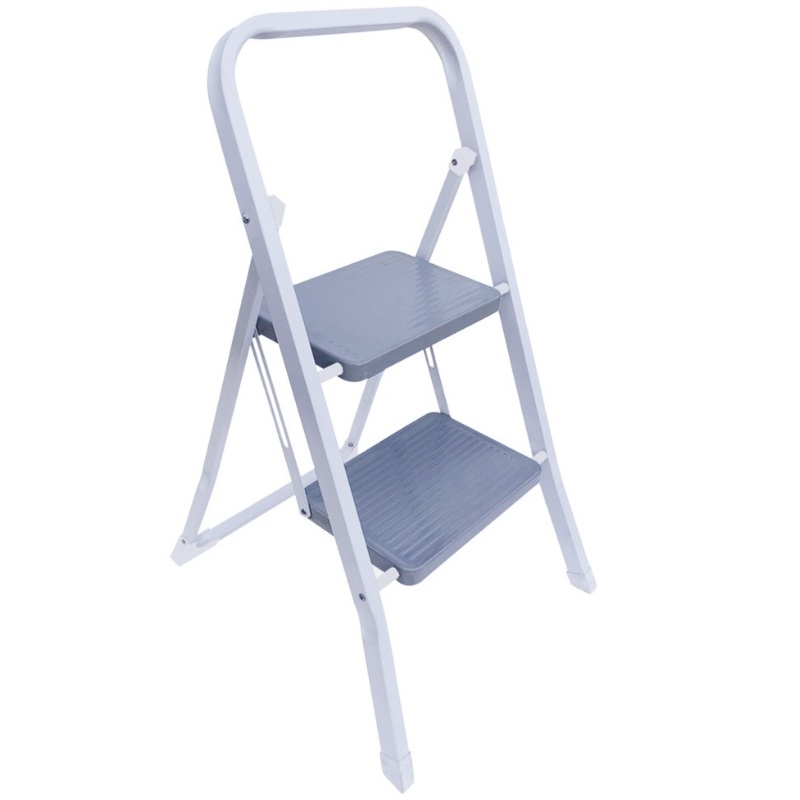Escalera de acero de 2 peldaños con acabado electroerosionado. Cuenta con una plataforma de acero y una alfombrilla antideslizante de 480 mm, sistema de seguridad antiapertura y patas antideslizantes de PE. Dimensiones: 200 x 300 mm