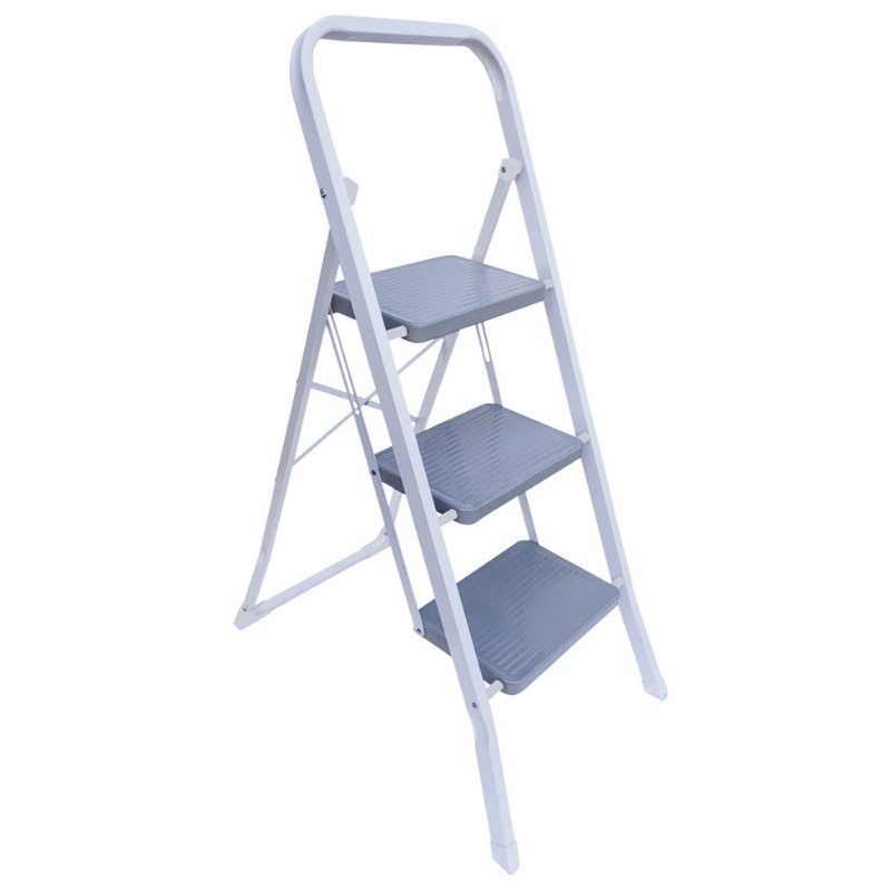 Escalera de acero de 3 peldaños con acabado electroerosionado. Cuenta con una plataforma de acero y una alfombrilla antideslizante de 480 mm, sistema de seguridad antiapertura y patas antideslizantes de PE. Dimensiones: 200 x 300 mm
