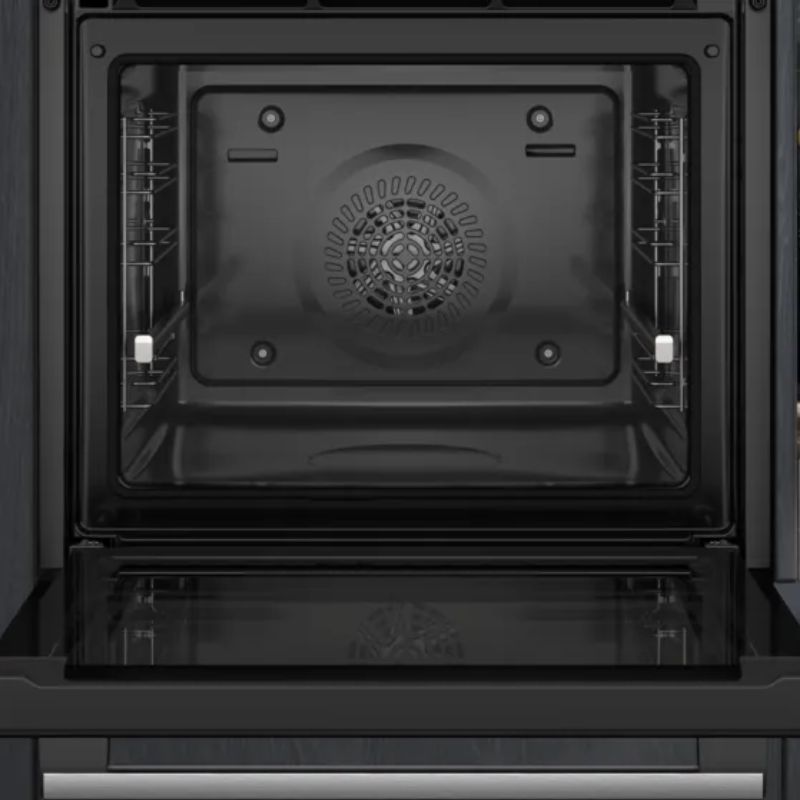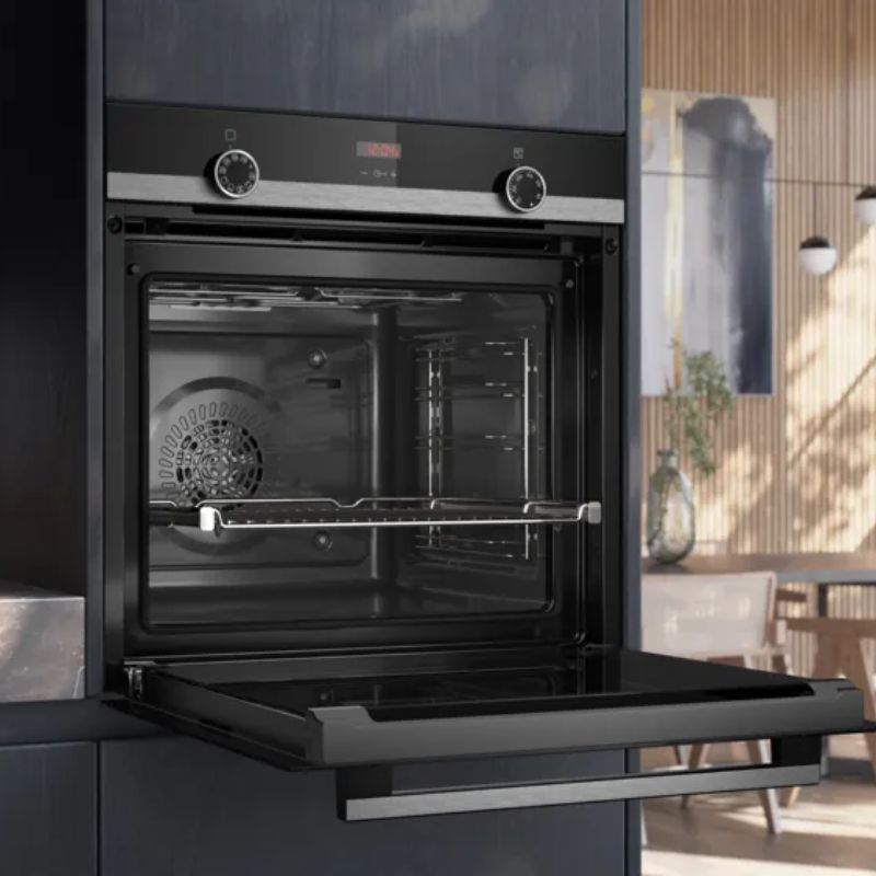 Gracias a las guías telescópicas, las bandejas y rejillas se pueden extraer fácilmente del horno. Las guías las mantienen firmemente en su lugar. Para que disfrutes al máximo de tu experiencia de principio a fin. Asistente de limpieza humidClean