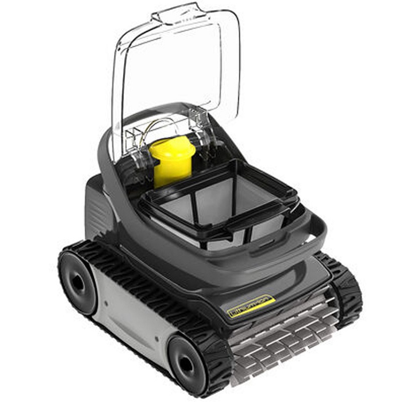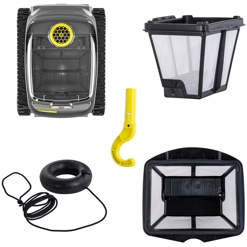 Gracias a su ventana transparente, puede comprobar inmediatamente la cantidad de suciedad en el filtro. El filtro es fácilmente accesible desde la parte superior del robot, lo que facilita su limpieza. Una vez finalizado el ciclo de limpieza, el robot se detiene junto a la pared de la piscina para facilitar su extracción del agua. Con el tiempo, el robot se hundirá hasta el fondo y podrá extraerse fácilmente del agua con el gancho incluido.