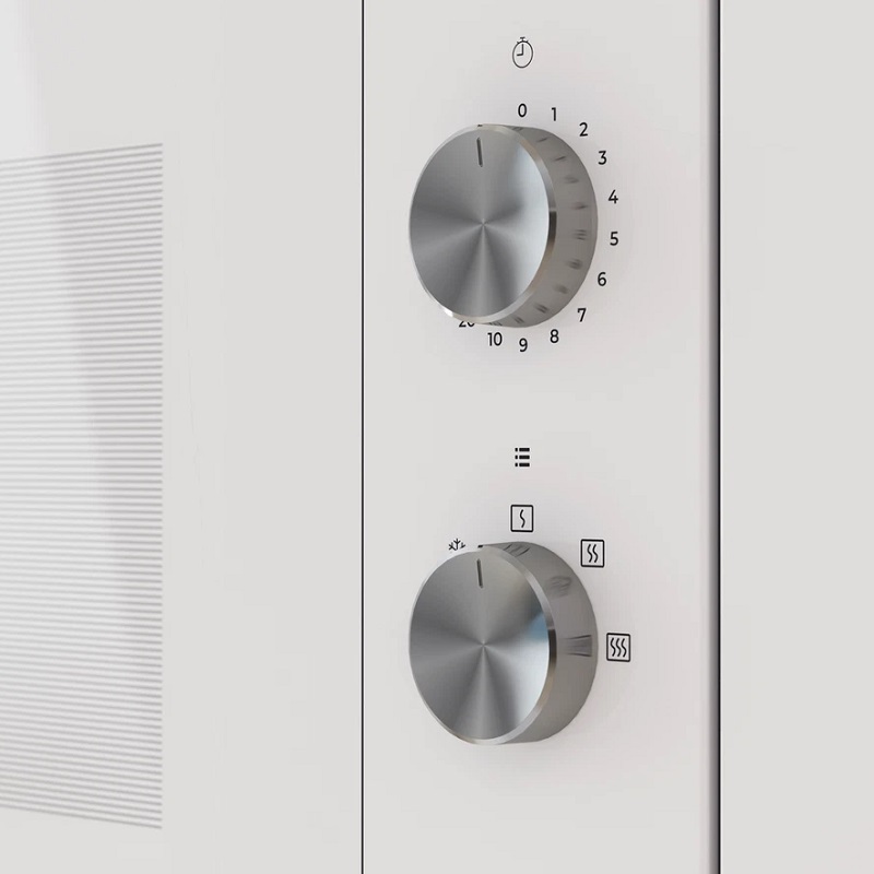 El panel de control giratorio, intuitivo y robusto, permite ajustar fácilmente los niveles de potencia y los programas, proporcionando un control preciso para diversas recetas, desde la descongelación hasta preparaciones rápidas. Su color blanco añade un toque de elegancia y complementa cualquier estilo de cocina.