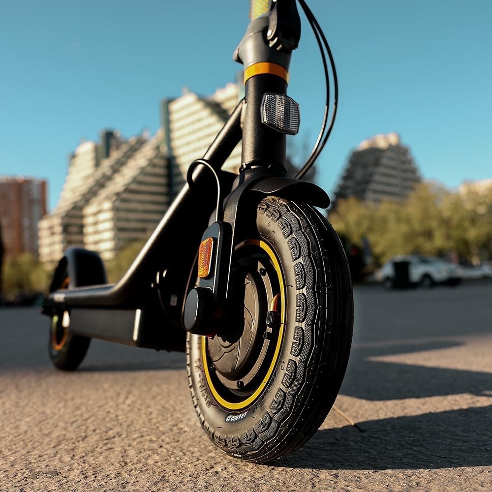 Excelente agarre, neumáticos inflables de 10 pulgadas para máxima tracción y comodidad en la ciudad, sistema de doble frenado para garantizar la seguridad, freno delantero eléctrico y freno de disco trasero para mayor seguridad en cada viaje.