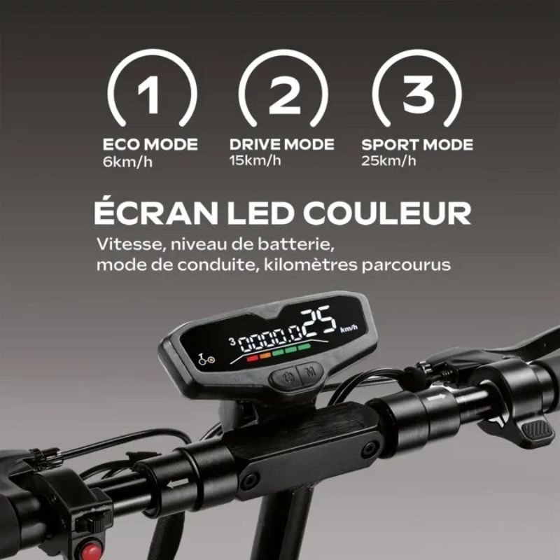 Pantalla LCD extragrande con velocidad, nivel de batería y modos
