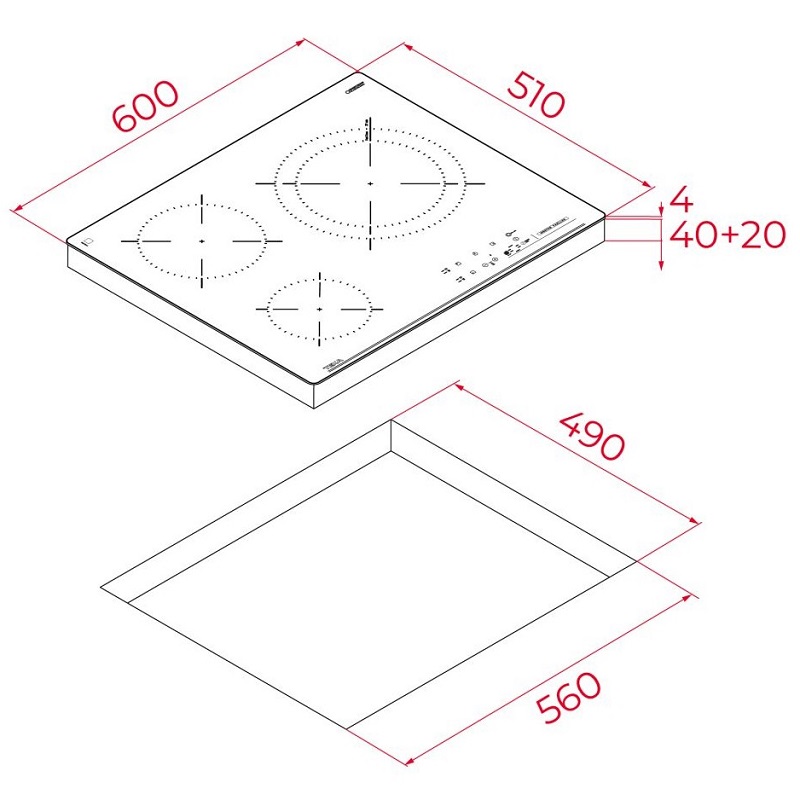 Gracias a sus dimensiones estándar, esta placa de cocción es fácil de instalar. Con 600 mm de ancho, 510 mm de profundidad y 64 mm de altura, se adapta perfectamente a la mayoría de las encimeras estándar. Su sistema de montaje intuitivo reduce el tiempo de instalación y facilita una integración perfecta en su cocina.