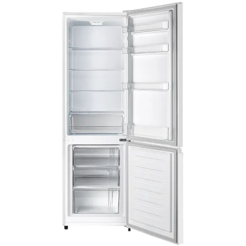 Refrigerador con sistema de enfriamiento cíclico, compresor universal y refrigerante R600a. Clase energética E y nivel máximo de ruido de 39 dB. Diseño en color blanco con dos puertas reversibles de fácil apertura. Iluminación interior LED. Sistema de control manual, descongelación manual y funciones optimizadas para un rendimiento máximo. Capacidad total de 269 litros, con congelador de 4 estrellas y múltiples compartimentos para un almacenamiento óptimo.