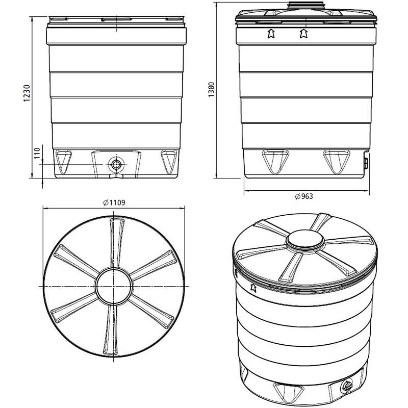 Tanque de HDPE reforzado con protección UV para almacenar agua potable y otros líquidos químicamente compatibles. Su diseño y tapa de apertura total facilitan la manipulación para mezclar y disolver aditivos, fertilizantes y otros líquidos químicamente compatibles. Tapa superior DN 250, con opción de instalar un flotador o un rebosadero. 10 años de garantía. Resistente