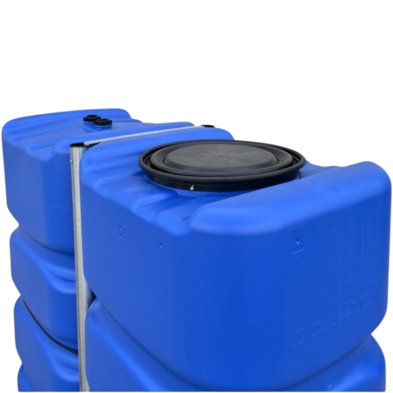 Tanque de PE-AD azul reforzado con protección UV para almacenar agua potable y otros líquidos químicamente compatibles. Tapa superior DN 560, dos salidas superiores S75 y opción de instalar una boya con flotador y/o rebosadero. Puntos premarcados para la instalación de accesorios. Garantía de 10 años.