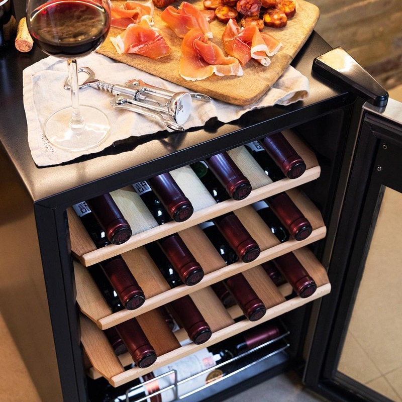 Tiene capacidad para hasta 20 botellas. Disfruta de su amplio interior y guarda tus vinos favoritos para disfrutarlos cuando quieras. Alto rendimiento. La vinoteca está equipada con un compresor que garantiza un bajo nivel de ruido y un alto rendimiento, para que tus vinos se mantengan siempre en óptimas condiciones. Funcionamiento silencioso y sin vibraciones. La vinoteca genera tan solo 39 dB de ruido, lo que garantiza un funcionamiento silencioso y sin vibraciones.